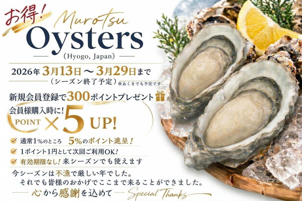 - 🦪【室津牡蠣の直売通販】ポイント5倍キャンペーン実施のご案内(2026年3月13日~)