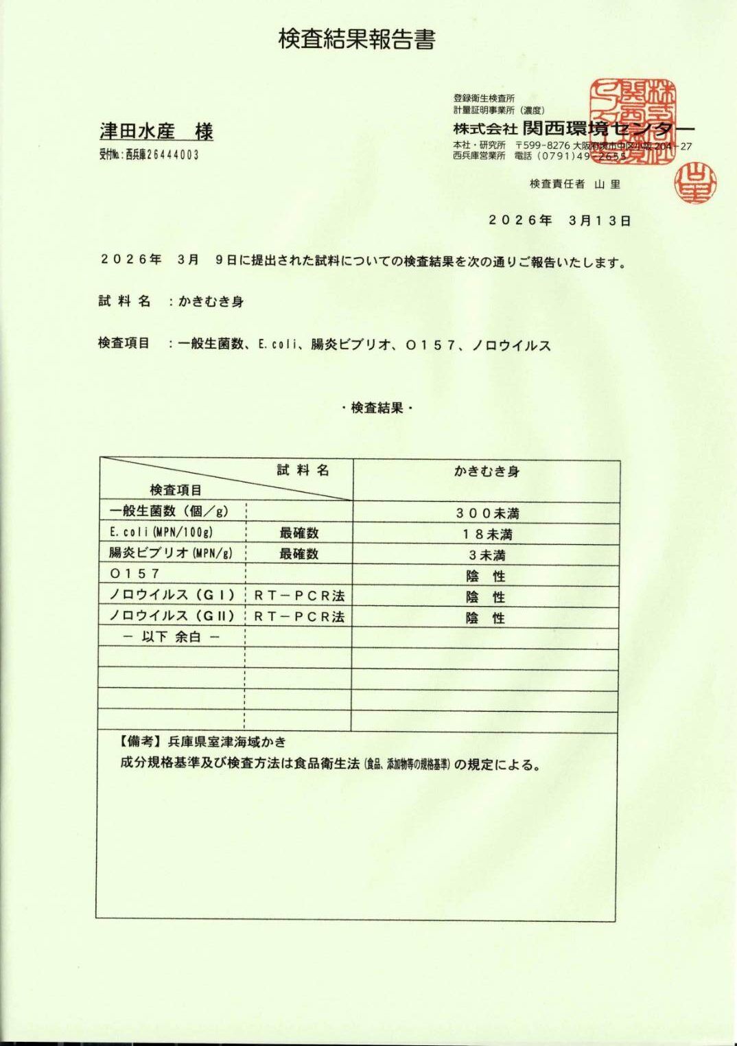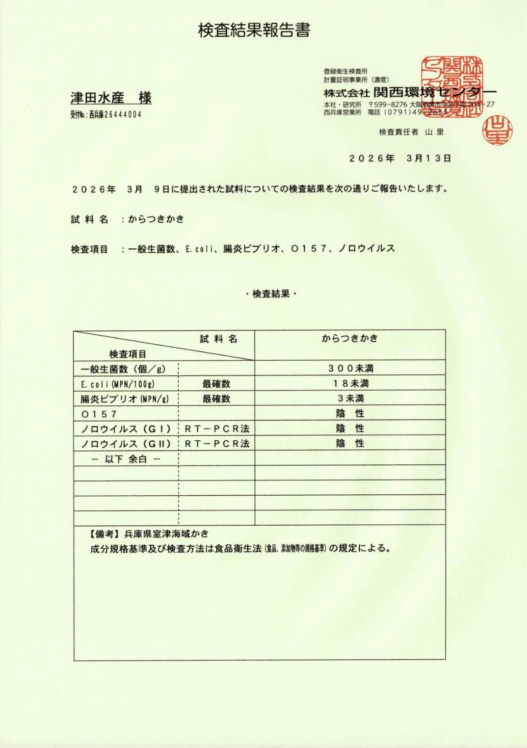 2026年3月13日付の検査結果において、「かきむき身」および「からつきかき」の両試料ともに、ノロウイルス、O157、大腸菌などすべての項目で基準をクリア(陰性・適合)いたしました。